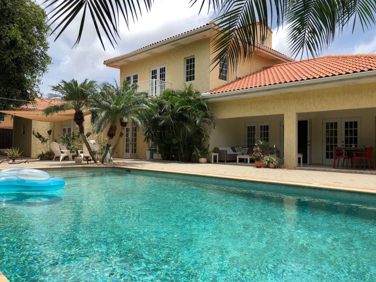 FOR RENT Royal Gardens Villa Curacao WITH LARGE POOL At the luxury resort Royal Gardens Curacao is this beautiful villa for rent. Royal Gardens is a highly secured (24 / 7) boutique resort. The gardens are tastefully laid out and the resort is quiet and very classy. There are two tennis courts for common use. Royal Gardens is known as one of the most prestigious and best secured resorts on Curacao. This villa is constructed on a double lot, for that extra space! The villa has five bedrooms and four bathrooms and a maidenroom. The large bedrooms have walk-in closets. All areas of the house are well maintained. Kitchen and living room have air conditioning. The luxury kitchen is of excellent taste and has all necessary equipment. Behind the kitchen there is a pantry for the wasmachine and dryer. Of course, the villa has access to hot water and there is even a generator for the entire capacity of the house. The bedrooms have split units for the airconditioning. The villa is complemented by a garage for two cars. The villa is surrounded by beautiful mature garden, a romantic gazebo, a playground and a very large swimming pool. The villa will be delivered partly furnished. Royal Gardens is located very close to schools, businesses and shops.