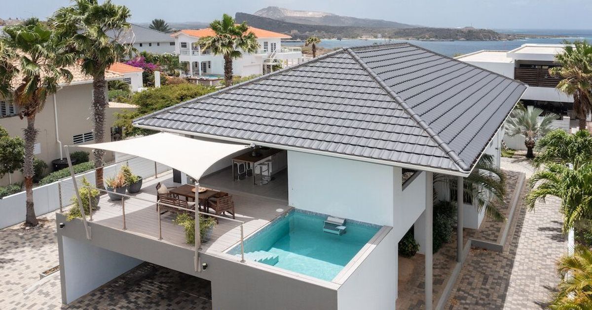 FOR SALE VILLA VISTA ROYAL CURACAO BEACH ON WALKING DISTANCE Do you enjoy the tropical life in beautiful Vista Royal and you like excellent rental airbnb options? Then this villa is for you. This modern, bright villa enjoys excellent wind exposure and is eco-friendly built with green blocks, an energy efficient, hurricane resistant and fire retardant building block. The house is located on a plot of 880 m2 and is built on 2 floors. On the top floor, the side overlooks the beautiful Fuik Bay and the monumental Quarantine building and the front overlooks Vista Royal and the nature reserve of the beautiful salt pans of Jan Thiel. On this floor is the living room with a modern, open plan kitchen by Brugman, equipped with a large amount of soft close cabinets, double door refrigerator, dishwasher, oven and 5 burner gas stove. High-quality materials have been used throughout the house, such as the Italian large tiles. Large windows and doors by Vermaas and the high ceiling provide a lot of light and a feeling of space. The spacious sliding doors at the front allow you to enjoy the veranda made of a maintenance-free Timbertech wood-look deck. The salt water chloride dip pool has a professional swimming machine which makes it possible to swim laps. Through the hallway to the rear are the 3 bedrooms. The two first bedrooms on one side of the hall are off a pleasant size, also with high ceilings and large windows. Between these two bedrooms is a spacious bathroom with shower, sink and toilet. On the other side of the hall is the very spacious master bedroom, partly overlooking the sea. Through a beautiful frosted glass pocket door you enter the bathroom with double sink, rain shower and toilet. A beautiful window in the hall gives, in addition to the abundance of light, a beautiful view of the attractive courtyard garden. At the rear is a balcony over part of the first floor. On the ground floor, at the rear of the villa, there is a studio with a bedroom and living room, kitchen and an ensuite bathroom. The view is on the inner garden. The adjacent extra space is currently used as storage for all sports equipment but can easily be added to the studio as an extra bedroom. At the front is the spacious covered carport for 2 cars. Here too, all facilities are available to make a second studio possible. There is a smaller storage area on the ground floor and a separate spacious room where the washing machine is located. Neatly concealed behind a cupboard wall is the pool pump for the Aqua Rite salt chloride system for the pool. The entire site is paved and equipped with a gazebo where it is wonderful to sit and entertain. The tropical plants are watered via the drip system by the gray water from the bathrooms and the kitchen that is collected in the septic tank. The villa has both 220 and 110 volts available. Wifi is available in the entire building. The gate leading to the villa is electrically operated. The villa was built in 2010. Official asking price is in Euro 795.000 k.k all other published currencies are only for your convenience. Recent ( July 2021) valuation report available on request.