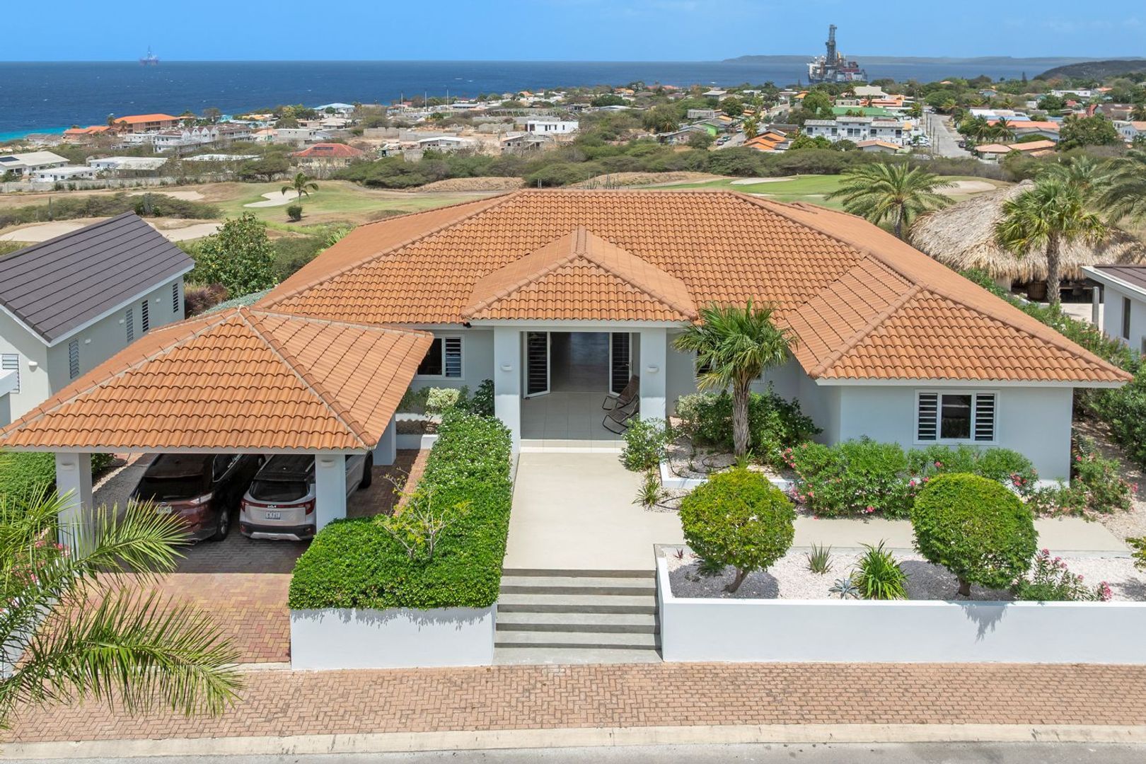 Aan de rustige buitenring van het prestigieuze Blue Bay Golf & Beach Resort ligt deze moderne familievilla, een oase van rust, ruimte en panoramische vergezichten. De woning kijkt uit over de groene fairways van de golfbaan, de azuurblauwe Caribische zee en het glooiende heuvellandschap richting het westen van Curaçao. Hier voelt thuiskomen als vakantie, elke dag opnieuw. Bij binnenkomst wordt u verwelkomd in een lichte, royale woonkamer met hoog plafond. De ruimte loopt naadloos over in een riante overdekte porch, die zich uitstrekt over de volledige breedte van de woning. Grote schuifdeuren vervagen de grens tussen binnen en buiten en creëren een ultieme binnen-buiten beleving. Rechts van de woonkamer vindt u een comfortabele zithoek, perfect voor gezellige filmavonden. Links bevindt zich de lichte open keuken, voorzien van alle gemakken en ruimte waar iedere kookliefhebber blij van wordt. Achter de woonkamer ligt een ruime, lichte kantoorruimte—ideaal voor werken vanuit huis in alle rust. Via de gang bereikt u drie slaapkamers, allemaal voorzien van airconditioning. De master bedroom heeft openslaande deuren naar de porch en het zwembad, voor een verfrissende ochtendduik of een avond onder de sterren. Er is een adembenemend uitzicht over de zee, de golfbaan en het omliggende landschap vanuit de master bedroom. Uiteraard beschikt deze kamer over een eigen en-suite badkamer. De comfortabel bemeten tweede en derde slaapkamers delen een ruime badkamer. Aan de andere zijde van de woning bevindt zich een vierde, knusse slaapkamer, eveneens met eigen badkamer. Op de begane grond vindt u verder een praktische pantry met wasopstelling en via het pad naar de benedenverdieping treft u een aparte berging voor fietsen en overige spullen. Op de benedenverdieping bevindt zich een royaal appartement met woonkamer, keuken, slaapkamer, badkamer en privéterras—perfect voor gasten of als zelfstandig studioverblijf. Uw auto’s parkeert u op eigen terrein onder de dubbele carport. De villa wordt omringd door een volgroeide tropische tuin met kleurrijke oleanders, geurige jasmijn en sierlijke palmbomen. Een levendig stukje natuur rondom uw thuis. Als bewoner van Blue Bay profiteert u van alle voorzieningen van dit luxueuze resort: een prachtig wit zandstrand, een 18-holes golfbaan, tennisbanen, moderne fitnessruimte, wandel- en jogpaden én uitstekende restaurants zoals het populaire “Brass Boer.” Uw privacy en veiligheid zijn gegarandeerd dankzij een 24/7 bemande toegangspoort en beveiligingspatrouilles. De maandelijkse VvE-bijdrage bedraagt ANG 459. Een uniek en rustig deel van Blue Bay waar thuiskomen altijd heerlijk is. Geïnteresseerd? Neem contact op met makelaar Jacqueline Remmelts voor meer informatie of een bezichtiging via +599(9) 5123803.