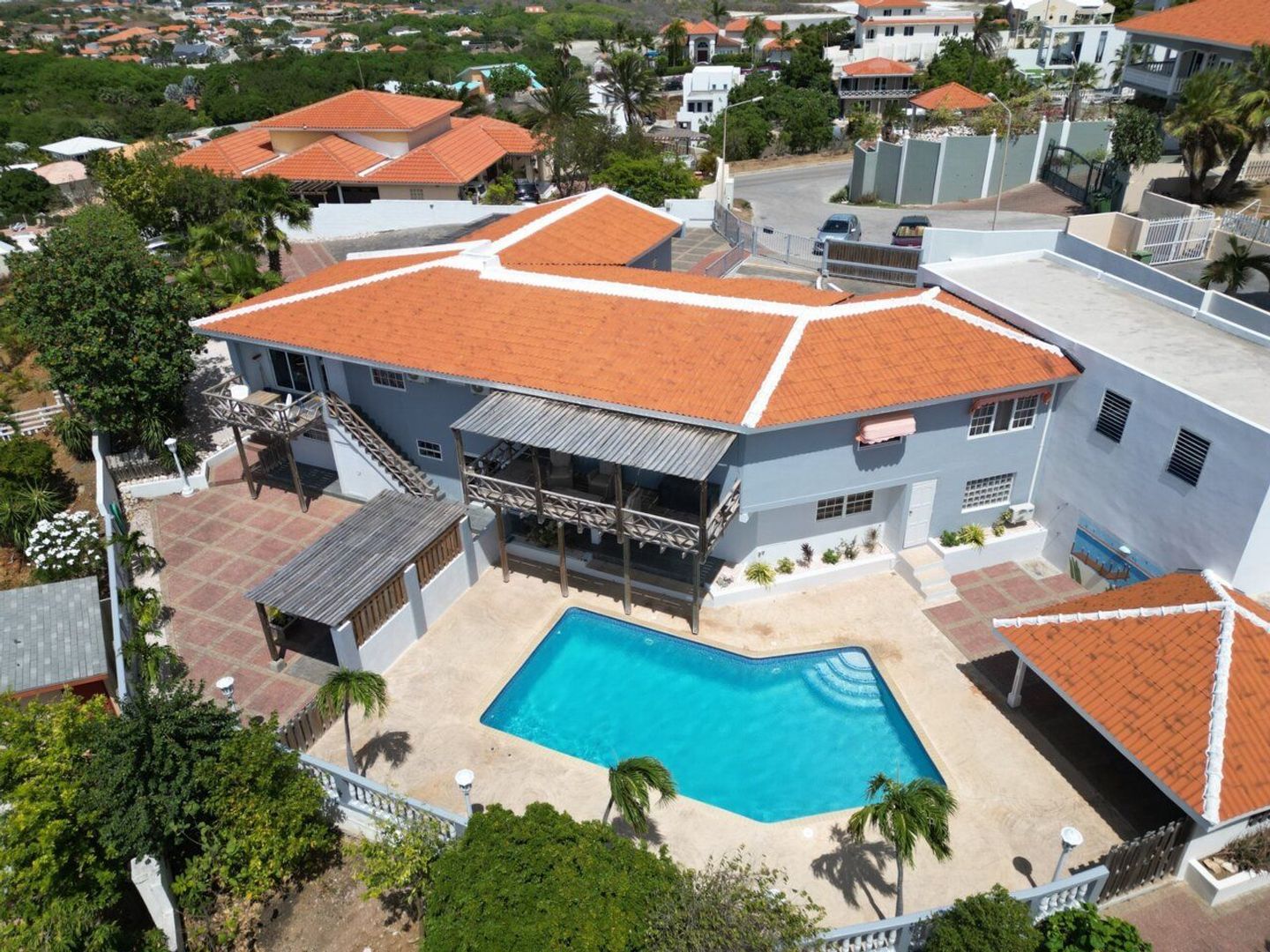 Hoog gelegen ruime villa met drie mooie appartementen, garages en zwembad Bottelier te koop De wijk Bottelier is gelegen ten oosten van het eiland, populair vanwege zijn goede ligging ten opzichte van stranden, winkels en scholen. Mambo Beach ligt op slechts 5 minuten afstand en Punda ligt op 10 minuten afstand met de auto. In de nabije omgeving zijn diverse restaurants, supermarkten, scholen en uitgaansgelegenheden te vinden. De villa is gebouwd in 1994 en in 2016 - 2017 volledige verbouwd en zijn tevens de twee naast gelegen appartementen gebouwd. Het derde appartement beneden en de garage aan de linkerzijde van de villa, zijn in 2020 gebouwd. De villa en de mooie appartementen zijn gelegen in een cul-de-sac op een groot hoekperceel van 1.710 m2, volledig omheind met een elektrische schuifpoorten. Het perceel met de appartementen heeft een tropische tuin met parkeerruimte voor 10 auto’s. De villa is zeer goed onderhouden en ligt door de hoge ligging van het perceel gunstig op de wind. Villa: Via de entree aan de voorzijde van de villa, komt men in de hal. De villa heeft een ruime woonkamer (met airconditioning) heeft een overdekte porch op het zuiden en een grote eetkamer met een ruime open keuken voorzien van een Amerikaanse koelkast, en een 5-pits gaskookplaat. Verder zijn er op deze verdieping twee slaapkamers (met airconditioning) en twee badkamers met een douche, wastafel en een toilet. De villa heeft aan de achterzijde een ruim terras met een groot zwembad (12m x 5m) en palapa. Het zwembad is tevens apart bereikbaar vanaf de appartementen. Onder de trap van 1 van de appartementen bevindt zich een wasruimte met wasmachine. Onder de villa bevinden zich twee kleinere garages met elk een eigen toegangsroldeur en diverse bergruimten, die te bereiken zijn via de trap in de woonkamer. Naast de villa is nog een ruime garage (60 m2) met elektrische toegangsroldeur aanwezig en er is nog een extra toilet. Onder de garage bevindt zich een grote berging / opslagruimte van 60 m2. Totale oppervlakte garage boven, beneden en de bergruimten is 190 m2. Bij de villa bevinden zich drie ruime appartementen die van alle gemakken zijn voorzien en worden momenteel met succes verhuurd aan toeristen via diverse platformen. Alle meubels en apparatuur in de appartementen zijn inbegrepen bij de vraagprijs Appartement 1: Het stijlvolle 2-persoons appartement, van ca. 67,5 m2, is perfect voor een ontspannen vakantie. Dit appartement is volledig uitgerust met alle comfort: een gezellige woonkamer met TV, een open keuken voorzien van een 5-pits gaskookplaat en een ruime koelkast met vriesvak. De badkamer beschikt over een toilet, douche en wastafel. De slaapkamer heeft een comfortabel 2-persoonsbed (1.80 m × 2 m), airconditioning en een ruime kledingkast. Buiten kan men heerlijk genieten op je eigen terras men een schitterend uitzicht op onze weelderige tropische tuin of ontspannen bij het gemeenschappelijke zwembad met ligbedden en een extra terras. Appartement 2: Het moderne 2-persoons appartement, van ca. 45,5 m2, welke is voorzien van alles wat je nodig hebt voor een relaxte vakantie. Vanaf de porch heeft men een prachtig uitzicht op het zwembad en kijkt over de wijk die beneden is gelegen. Net zoals appartement 1 is deze compleet ingericht; woonkamer met TV, open keuken met 4-pits gaskookplaat en grote koelkast met vriesvak. Badkamer met toilet, douche en vaste wastafel. Slaapkamer met 2-persoonsbed (1.80 m × 2 m), airco en ruime kledingkast. Men kan gebruik maken van het gemeenschappelijk zwembad met ligbedden en nog een extra terras. Appartement 3: Het leuke 2-persoons appartement, van ca. 38,5 m2, is eveneens voorzien van alle gemakken voor een relaxte vakantie. Net zoals appartement 1 en 2 is dit appartement compleet ingericht; woonkamer met TV, open keuken met 4-pits gaskookplaat en grote koelkast met vriesvak. Badkamer met toilet, douche en vaste wastafel. Slaapkamer met 2-persoonsbed (1.80 m × 2 m), airco en ruime kledingkast. Buiten heeft men een eigen terras en kun je gebruik maken van het gemeenschappelijk zwembad met ligbedden en nog een extra terras. De mogelijkheid is aanwezig om van één van de garages en/of bergruimtes een vierde appartement, een ruime slaapkamer en/of kantoor te maken. Deze ruime villa is ideaal als woon/werk woning of voor een koper die graag veel gasten ontvangt en hen een privéruimte wil bieden. De prachtig aangelegde tropische tuin is voorzien van mooie palmbomen en planten. Er is een deepwell aanwezig. Kenmerken • Vraagprijs is ANG 1.675.000, - k.k. (sterk in prijs verlaagd!) • Hooggelegen met prachtig uitzicht • Perceeloppervlakte: 1.710 m2 • Woonoppervlakte: ca. 275 m2 (incl. appartementen) • Oppervlakte garages en bergruimten: ca. 190 m2 • Aantal slaapkamers: 5 • Aantal badkamers: 5 • Parkeergelegenheid op eigen terrein voor 10 auto’s • Twee garages onder en naast de villa één garage met grote berging/opslagruimte eronder • Ruim zwembad • 110 en 220V • Split-unit airconditioning in alle slaapkamers • Fraai aangelegde tuin met verlichting • Drie appartementen elk met woon/eetkamer, keuken, slaapkamer en badkamer. • Deepwell • Elektrische poorten en separate kleine toegangspoort • Zeer goed onderhouden. Ben je op zoek naar een ruime villa met drie mooie verhuurbare appartementen op een mooie locatie in Bottelier? Neem dan contact op met makelaar Fred Wight, hij laat je dit mooie object graag zien. Hij is te bereiken via whatsapp op +31619340458 of lokaal op +5999 5107077