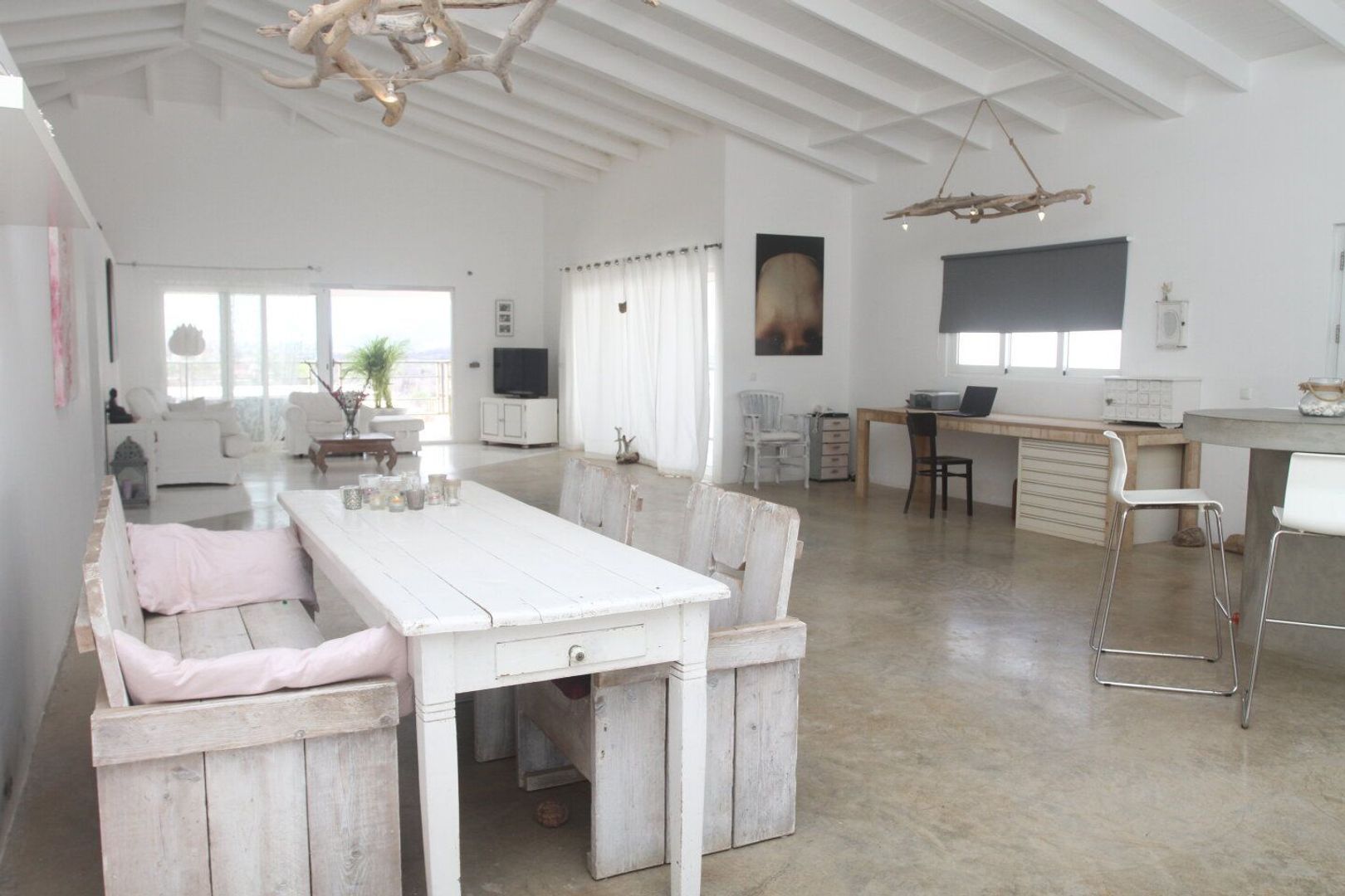 Deze heerlijke lichte woning is gelegen in de wijk Brakkeput Abou. U woont dus heel dicht bij de stranden van Jan Thiel, de zeil- en surfscholen op het Spaanse Water, de supermarkten en diverse leuke restaurants. Het is niet voor niets een populaire wijk om in te wonen. De woning is hoog gelegen waardoor u vanaf de bovenste verdieping mooi weids uitzicht heeft. Op de onderste verdieping is momenteel een kantoor en een grote werkruimte ingericht. Deze verdieping kan ook als appartement gebruikt worden zeker daar er ook een volledige badkamer aangelegd is. Een ruime berging complementeerd deze verdieping. De bovenste verdieping, gewoon toegankelijk vanaf de zijkant van het huis is helemaal in gebruik als woonverdieping. De zeer ruime woonkamer heeft een 'cathedral ceiling', wat een lekker ruimtelijk gevoel geeft.Vanaf de ruime porch heeft u mooi uitzicht op het Spaans water en de Tafelberg. Door de gunstige ligging van het huis is er de hele dag een lekker koel briesje in huis. Alles is uitgevoerd in mooie ton-sur-ton kleuren in een lichte tint. De gevlinderde betonnen vloer geeft de woning een moderne uitstraling. Ook de slaapkamers zijn ruim en hebben een moderne uitstraling. De ruime achtertuin grenst aan de bovenverdieping en is een fijne plek om te eten en te ontspannen. De oprit biedt ruimte aan drie auto's.