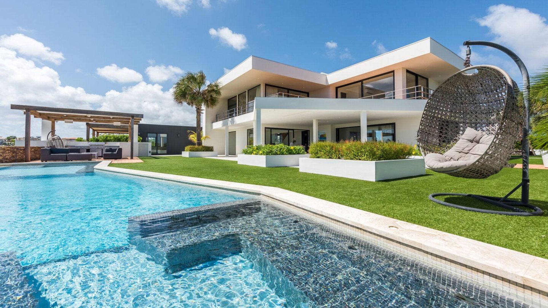 TE KOOP Zeer luxe villa met waanzinnig uitzicht over Spaanse Water Curacao Via een lange privé oprit door de Curaçaose natuur komt u aan bij de imposante poort. Via de intercom ( met video), kunt u gasten binnenlaten en deze rijden dan de licht glooiende helling op naar de ingang. De tuin is aangeplant met onderhoudsvrije lokale planten zoals agaves en aloe vera.De carport biedt plaats aan ruim 6 auto's. Via de ingang loopt u de prachtige villa binnen langs een deel van de woonkamer en komt u uit bij de zeer uitgebreide keuken vanwaar u via een imposante schuifpui toegang heeft tot de porch. Direct hier valt al op welk een waanzinnig uitzicht u heeft op het Spaanse Water en de Caribische zee. De keuken is onder andere voorzien van een massief 20cm dik rvs-werkblad van ABK, elektrische laden, 2 spoelbakken, cooker, meerdere koelkasten, 2 vaatwassers, espresso-apparaat, steamer, ovens en een wijnklimaatkast. Vrijwel alle apparatuur is van de topserie van Gaggenau. De keuken biedt ook plaats om lekker te ontbijten. Achter de keuken bevindt zich de grote woonkamer die ook weer grote in ral kleur gespoten aluminium schuifpuien heeft die toegang geven tot de achtertuin die thans is ingericht als speelruimte voor de kinderen met een ingegraven trampoline en een speeltoestel. De trap naar boven brengt u bij de slaapkamers,fitnessruimte en het riante dakterras. De masterbedroom heeft een eigen badkamer met een douche ruimte waar vanuit u ook, in alle privacy, spectaculair uitzicht heeft op het Spaanse Water en alle voorgelegen jachten. De twee kinderkamers delen een tussengelegen badkamer. De fitnessruimte (ook te gebruiken als extra slaapkamer uiteraard) is ingericht met high end apparaten van het merk Life Fitness en een WaterRower. Weer beneden aangekomen lopen we even terug naar de keuken en door naar de porch. Hier bevindt zich een grote (overdekte) leefruimte waar u heerlijk op de wind kunt eten of loungen met zicht op het zwembad en de buitenkeuken. Het infinity zwembad heeft een jacuzzi. De buitenkeuken van Boretti heeft een eigen koelkast en grillplaten. Beneden de buitenkeuken bevindt zich de pompruimte en een gastenbadkamer voor het zwembad gebruik en als u van het Spaanse water komt. Achter de buitenkeuken ligt het gezellige gastenverblijf welke twee slaapkamers en een badkamer heeft. Ook hier heeft u schitterend uitzicht. Het vrijstaande nieuwe appartement geeft u naast het gastenverblijf nog de mogelijkheid om een inwonende villa manager of verzorgers te huisvesten. Andere features van deze excellente villa zijn: - een geavanceerd domotica systeem, welke het gebruik van de verlichting, gordijnen, muziek, alarm- en camerasysteem regelt overal, waar ook ter wereld, met de telefoon of met de diverse schermen. - Er is zowel binnen, buiten en zelfs rondom het terrein volledige wifi-ontvangst - Alle vertrekken zijn voorzien van een Sonos geluidssysteem. - De gehele woning is voorzien van, uit Nederland geïmporteerde, aluminium kozijnen, 11 schuifpuien, massief Frans eiken balken en schutters - Verlichting telt meer dan 250 led-spots - Zonnepanelen - Door de gehele villa inbouwkasten. - De tuin heeft een volledig geautomatiseerd irrigatiesysteem. De riante afmeting van de kavel, de verhoogde ligging en het vele groen bieden een oase van rust en volop privacy. Het uitzicht is wellicht het mooiste van geheel Curaçao; In vrijwel alle vertrekken heb je prachtige vergezichten over het Spaanse water, de Caribische zee en de Tafelberg. Brakkeput Mei Mei ligt in het meest geliefde deel van het eiland; De stranden, boulevards en restaurants van Jan Thiel en Mambo beach zijn op enkele minuten met de auto of boot te bereiken. Deze minimalistische villa combineert een strak en modern lijnenspel met vele natuurlijke materialen voor warmte en comfort en is gebouwd door een uit Nederland ingevlogen bouwteam waardoor de absolute topkwaliteit gewaarborgd is. De officiële vraagprijs is Euro 3.295.000 k.k. de andere valuta zijn opgenomen als referentie