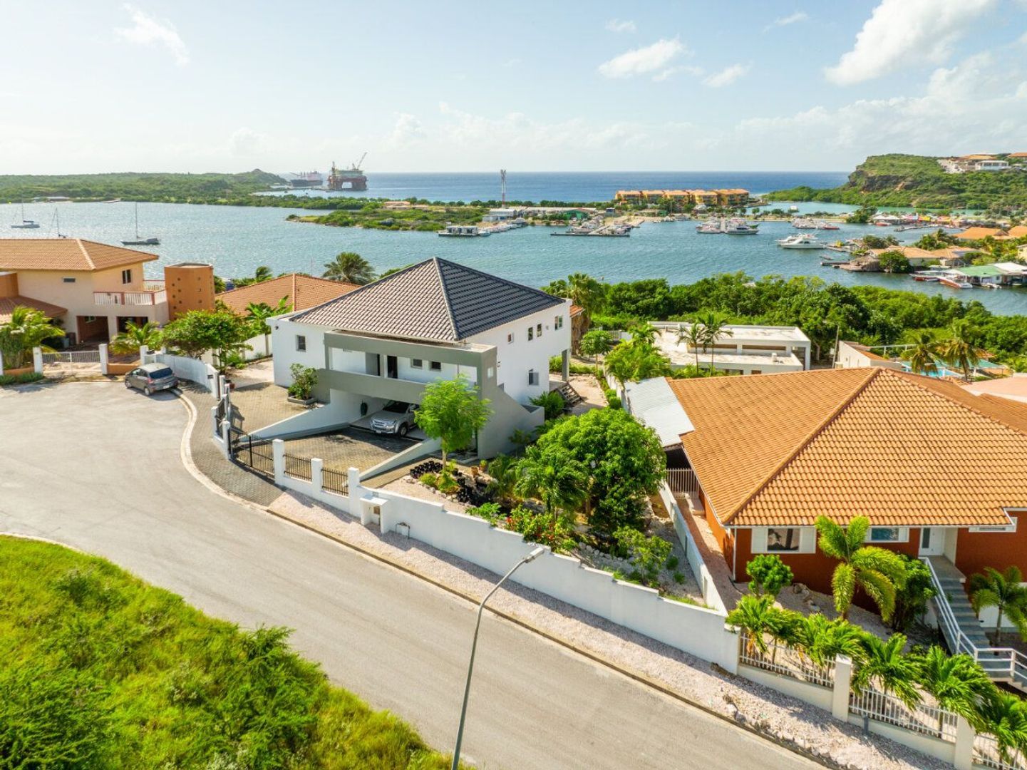 Te koop: Elegante moderne villa incl. appartement met schitterend uitzicht over de jachthavens aan het Spaanse Water Deze moderne, lichte villa is gelegen in Brakkeput Abou. De geliefde villawijk Brakkeput Abou is gelegen tussen Jan Thiel en het Spaanse Water. Nabij vindt u diverse jachthavens, uitgaansgelegenheden, supermarkten, restaurants, duikscholen, sportscholen, stranden en groengebieden om te hiken, mountainbiken en te genieten van al het moois wat Curacao te bieden heeft. U rijdt door de elektrische poort de royale oprit op. Via de bordes trap bereikt u de verhoogde galerij van waaruit u de villa betreedt. Bij binnenkomst, via de riante deur, opent zich een hal die leidt naar de lichte woonkamer met hoog zadeldak. U heeft direct zicht op de schitterende jachthavens die het Spaanse Water rijk is. De woonkamer heeft aan de achterzijde een luxe, prachtig afgewerkte hout look keuken met bar. De open keuken is afgewerkt met een natuursteen blad en beschikt over alle apparatuur; een vijf pits gasfornuis, een dubbele wasbak, oven en een dubbel deurs koelkast. Grote raampartijen boven het keukenblok geven u tijdens het koken prachtige vergezichten over het Spaanse Water en de zee. De linkerzijde van de keuken is deels open waardoor de keuken in open verbinding staat met de veranda. De achter- en linkerzijde van de woonkamer is nagenoeg geheel te openen via een schuifpui. De natuurlijke overgang tussen de woonkamer en de veranda is excellent uitgevoerd waardoor het buitenleven heerlijk vertoeven is. De royale veranda met ruimte voor een grote diner tafel en lounge is de perfecte plek om in rust en privacy van het prachtige uitzicht te genieten. Vanuit de woonkamer heeft u toegang tot de hoofdslaapkamer met een zeer ruime en-suite badkamer. De hal geeft toegang tot een tweede riante slaapkamer die momenteel wordt gebruikt als kantoor. Daarnaast vindt u een separate, ruime badkamer, uitgevoerd in identieke stijl. Ook bereikt u vanuit de hal een gastentoilet. Een separaat, volwaardig appartement bevindt zich op de benedenverdieping. Het appartement is voorzien van een fijn bemeten woonkamer met keuken, een slaapkamer met inloopkast en een badkamer. Vanuit de woonkamer stapt u het aanzienlijke, overkapte, houten terras op dat zich uitstrekt over de gehele breedte van de villa. Het terras is groot genoeg voor het plaatsen van een diner tafel, lounge set en ligbedjes. Ook vanaf hier geniet u van het heerlijke uitzicht. Het appartement biedt uitstekende verhuurmogelijkheden. Vanaf de poort rijdt u direct de carport in waar genoeg ruimte is voor het plaatsen van twee auto’s. Aangrenzend aan de carport vindt u een grote berging met wastafel. Aan de terraszijde is een tweede afsluitbare berging gesitueerd. De gehele tuin is omzoomd met tropische beplanting, er is voldoende ruimte voor het creëren van een zwembad. Let op! De vraagprijs van 1.450.000 Naf is de leidende prijs.