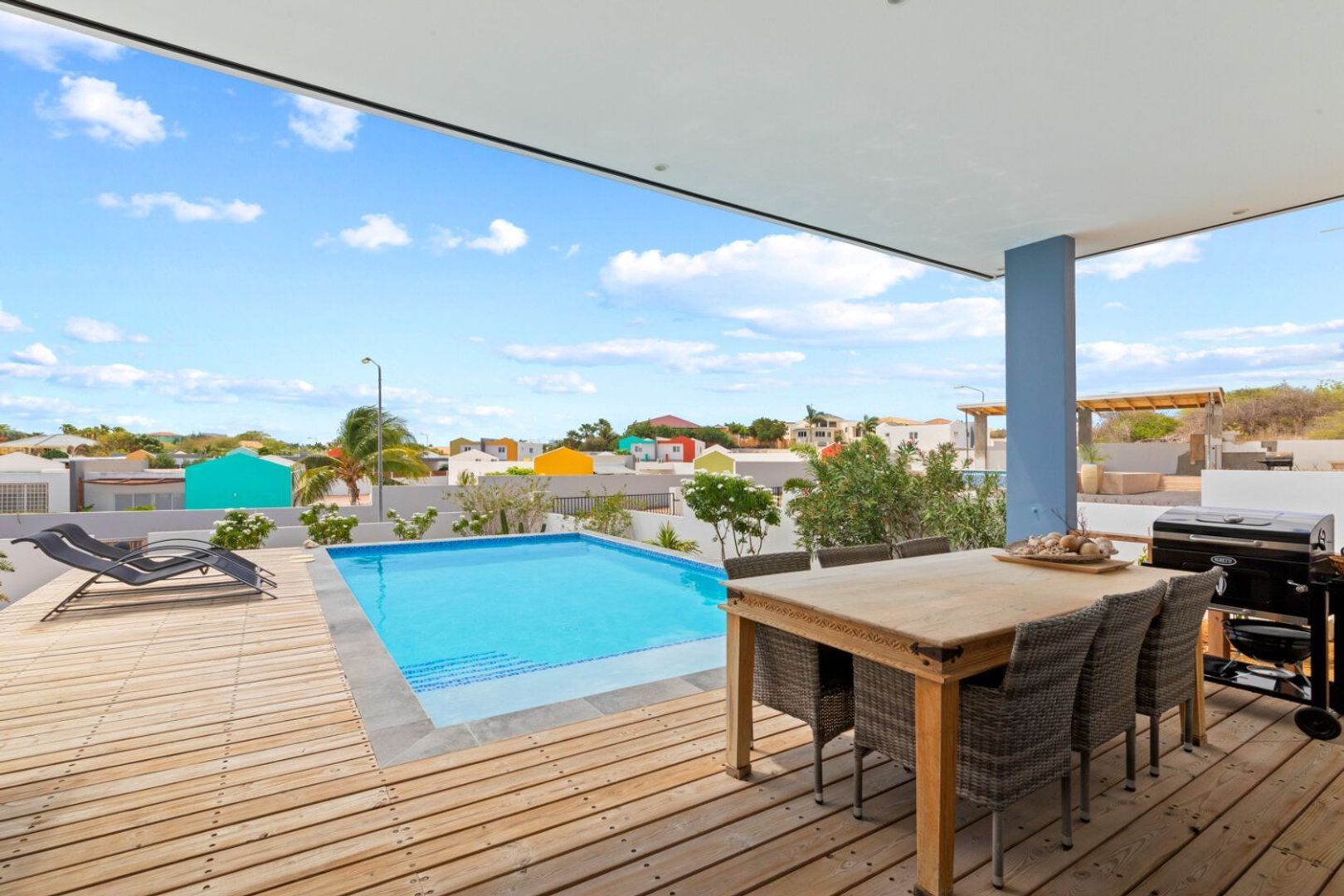 Moderne bungalow met flexiblele mogelijkheden! Ontdek de charme van modern tropisch wonen in deze moderne, lichte bungalow met zwembad, gelegen nabij de prachtige stranden van het populaire Jan Thiel-gebied. Deze compacte bungalow in Brakkeput is de perfecte combinatie van comfort, stijl en functionaliteit. Met hoogwaardige materialen gebouwd, gelegen op een ruim perceel van 750 m2 in een rustige straat met alleen bestemmingsverkeer, biedt deze woning alles wat u nodig heeft om te genieten van het leven op Curaçao. De villa is reeds geprepareerd voor het bouwen van een tweede verdieping, wat het tot een interessante investeringsmogelijkheid maakt! Bij binnenkomst van de woning wordt uw aandacht meteen getrokken naar de moderne, strakke keuken met luxe kookeiland. Deze royale opstelling is het hart van de woning en is ontworpen met oog voor detail: een quartz keukenblad met spoelbak en een 5-pits kookplaat, royale lades voor al uw keukengerei, een ingebouwde oven, een Amerikaanse koelkast en een vaatwasser. Het kookeiland biedt ook zitruimte om gezellig samen te komen, zodat u uw gasten kunt entertainen terwijl u aan het kokkerellen bent. Het lichte en open karakter van de keuken en de woonkamer wordt versterkt door de grote schuifdeuren die toegang geven tot de veranda en het zwembad. Hierdoor ervaart u een naadloze overgang tussen binnen- en buitenruimtes. De woning is optimaal op de wind gebouwd, waardoor de koele tropische bries door alle vertrekken waait en zorgt voor een prettig leefklimaat. Dit wordt nog eens versterkt door de grote shutterramen, gemaakt van in glas gevat aluminium, die niet alleen stijlvol zijn, maar ook zeer onderhoudsvriendelijk, veilig en duurzaam. Door de gehele woning ligt een prachtige en praktische betonvloer, wat zorgt voor een rustige, gebalanceerde en lichte sfeer. De bungalow beschikt over drie slaapkamers, waarvan twee ruime kamers aan de rechterzijde van de woning. Beide kamers zijn voorzien van inverter airconditioning voor een aangenaam verblijf en delen een moderne badkamer met royale inloopdouche, wastafel en toilet. De derde slaapkamer is iets compacter en heeft eveneens een inverter airconditioning. De bijbehorende badkamer met douche, wastafel en toilet ligt praktisch naast de kamer. Alle badkamers zijn voorzien van hoogwaardig sanitair en bieden een moderne uitstraling. De ruime open woonkamer biedt voldoende plek om heerlijk te loungen en televisie te kijken, terwijl de tropische wind voor natuurlijke verkoeling zorgt. Via de elegante schuifdeuren bereikt u de overdekte woonveranda, die uitkijkt op het uitnodigende zwembad met houten deck. Dit zwembad is een ideale plek om af te koelen en te genieten van het buitenleven. Het pooldeck geeft een prachtige aanblik en nodigt uit tot ontspanning in een rustige omgeving. Brakkeput, waar deze woning is gelegen, is een van de populairste gebieden op het eiland. Het ligt aan het Spaanse Water, vlakbij baaien en stranden zoals Jan Thiel Beach. Hier vindt u boulevards met winkels, restaurants, een sportschool, supermarkten, jachthavens, en een zeilschool. Ook natuurgebied Jan Thiel met de zoutpannen is binnen enkele minuten bereikbaar. Dit alles maakt deze locatie perfect voor zowel permanente bewoning als vakantieverhuur. Dankzij de strategische ligging en de faciliteiten die de woning biedt, is deze bungalow zeer geschikt als investeringsobject voor korte of lange termijn verhuur. Het perceel van 750 m2 biedt volop mogelijkheden voor verdere landscaping, waarbij u de tuin naar eigen smaak kunt inrichten. Aan de achterzijde van de woning is een klinkerterras aangelegd, ideaal voor een eettafel om heerlijk buiten te dineren. Er is ook een speciaal BBQ-plekje gecreëerd, perfect voor gezellige avonden met familie en vrienden. Het hele huis, inclusief het zwembad en het pooldeck, wordt ’s avonds prachtig verlicht, waardoor u ook in de late uurtjes van een sfeervolle ambiance kunt genieten. Via de elektrisch bedienbare poort rijdt u het beklinkerde pad op en parkeert u uw auto onder de carport, die ruimte biedt aan twee voertuigen. Deze carport is praktisch gelegen en zorgt ervoor dat uw voertuigen beschermd staan tegen de tropische zon. Door de gehele woning zijn stopcontacten van 220V aanwezig en het hang- en sluitwerk is van Europese kwaliteit, wat bijdraagt aan het comfort en de veiligheid van de woning. Deze moderne, lichte bungalow is niet alleen een fantastische plek om zelf te wonen, maar biedt ook uitstekende verhuurmogelijkheden. Bent u op zoek naar een investering op Curaçao of naar een woning waarin u optimaal kunt genieten van het tropische leven? Neem dan contact op met Jacqueline Remmelts via +5999 5123803 voor meer informatie en om een bezichtiging in te plannen. Let op: De leidende vraagprijs voor deze woning is ANG 1.300.000,-