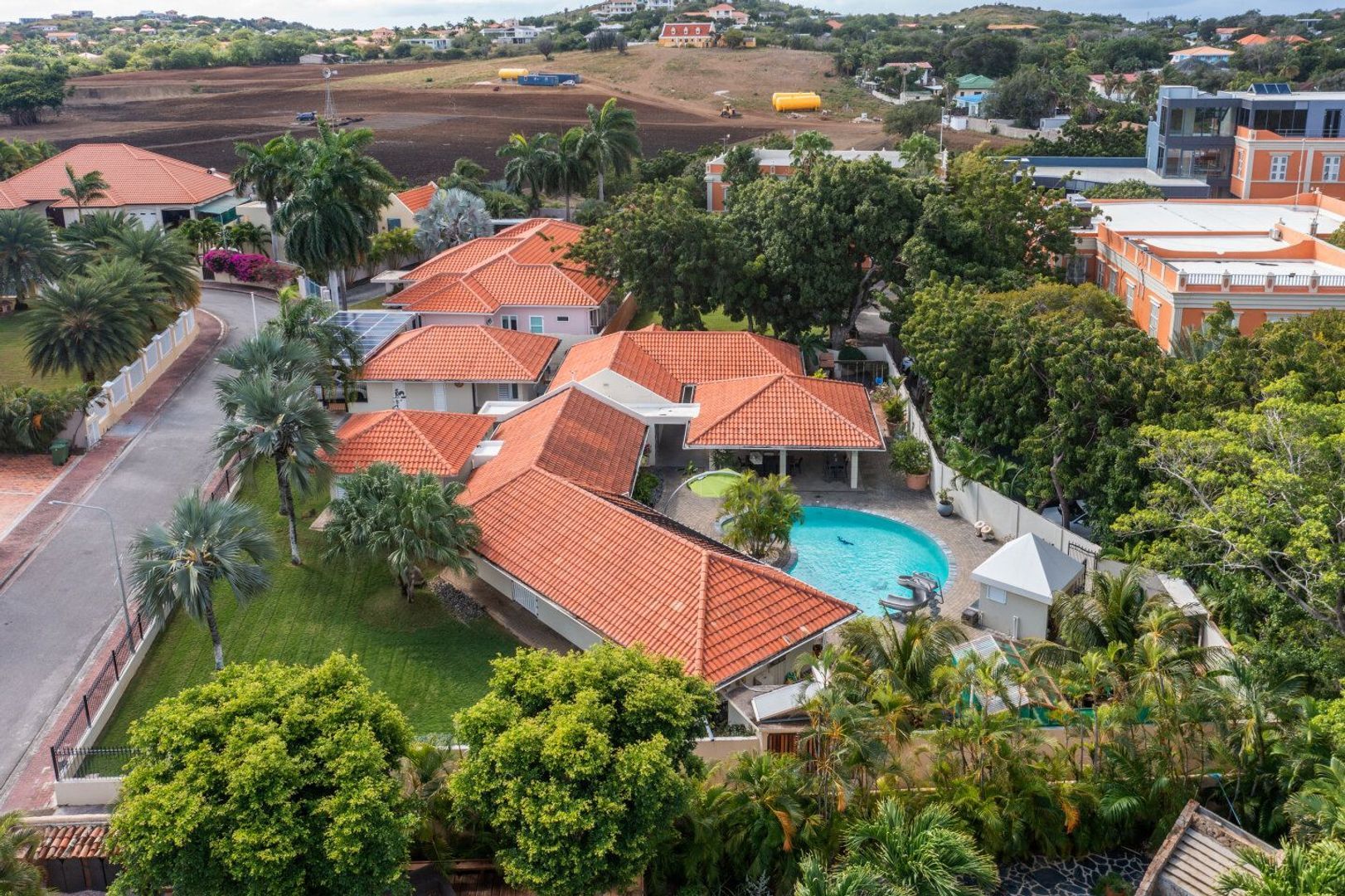 Uiterst centraal gelegen in de exclusieve, omheinde woonwijk van Joonchi, dicht bij Mahaai, ligt deze familievilla met een moderne kijk op tropische architectuur. Bij het betreden van deze gelijkvloerse woning bevindt u zich in het hart van de villa, waar de woonkamer, aparte entertainmentkamer en modern uitgeruste keuken en bijkeuken beide slaapkamervleugels met elkaar verbinden, bestaande uit 4 ruime slaapkamers - waarvan 2 met een inloopkast- en 3 badkamers en een studio-appartement met badkamer. Alle slaapkamers in de villa zijn voorzien van inverter airconditioning. De villa is gebouwd met duurzame, hoogwaardige materialen, is zeer goed onderhouden, modern en instapklaar. Naast de zonnepanelen voor een laag stroomverbruik is de villa voorzien van een generator en een aansluitpunt voor het opladen van uw elektrische auto. Deze villa is een zeer licht en luchtige woning door het grote aantal glazen luiken en deuren en zware kwaliteit aluminium kozijnen. Aan de volledige achterkant van de villa is er voldoende gelegenheid om privé te ontspannen onder de ruime overdekte terrassen en te entertainen rond het grote zwembad dat altijd op perfecte temperatuur is vanwege het verwarmingssysteem. Aan de voorzijde van de villa is er een garage die ruimte biedt voor 2 grote auto's. Er is extra parkeerplaats voor 3 auto's voor de villa. Het perceel is omheind met een decoratief hek en een mooi groen gazon en landschapsarchitectuur met volwassen palmbomen. De tuin wordt bewaterd met een geautomatiseerd dripsysteem en water uit de deepwell. Er is ook een kleine kas.