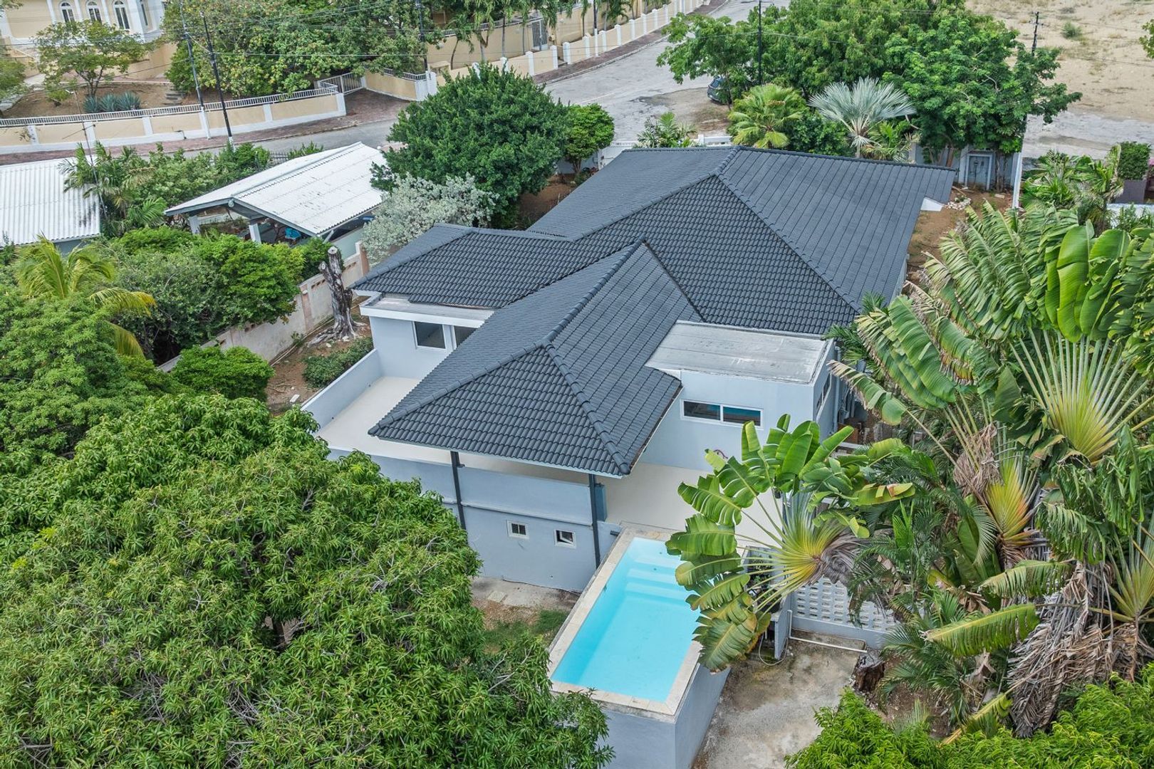 In het groene hart van Mahaai – het centraal gelegen, groene district van Curaçao, waar alles binnen handbereik ligt – staat deze volledig gerenoveerde tropenvilla op een riant perceel van 1.270 m². Zuikertuin Mall, scholen, bedrijven, restaurants en supermarkten bevinden zich op korte afstand, waardoor dit huis rust en gemak op een perfecte manier combineert. Via de verhoogde galerij, waar precies zo’n gezellig zitje past voor een ochtendkoffie, stap je binnen in de strak afgewerkte, moderne woonkamer. Licht, open en uitnodigend. Je loopt vanzelf door naar de eye-catcher van de woning: de zeer luxe keuken met een XL-kookeiland, afgewerkt met natuurgraniet. Hier vind je alles wat een thuiskok maar kan wensen: een royaal gasfornuis, dubbele ovens, een grote Amerikaanse koelkast, een vaatwasser en een wijnkoeler. Aan de zijkant van de living liggen drie prettig bemeten slaapkamers. Achterin bevindt zich de riante master bedroom met een en-suite badkamer die aanvoelt als een privé spa: ruim, stijlvol en uitgerust met een royale inloopdouche met uitgebreide massagefuncties. Ook de tweede en derde slaapkamer hebben elk een eigen luxe badkamer, en alle kamers zijn volledig airconditioned. Aan de achterzijde van de villa vind je een heerlijke, brede porch – deels overdekt en perfect op de wind. Een grote eettafel, een loungeset, lange avonden buiten… het past hier allemaal. Vanaf de lounge kijk je uit over het zwembad en de tropische tuin, die dankzij de volwassen beplanting en het groene decor direct het tropenleven onderstrepen. De trap leidt naar het benedenniveau, waar een ruime studio ligt met een eigen woonkamer, kitchenette, moderne badkamer en slaapkamer. Langs de gang bevinden zich nog drie multifunctionele ruimtes (bijvoorbeeld een wasruimte, kantoor of extra slaapkamers) én een moderne badkamer. Dankzij de aparte entree is dit niveau ideaal voor verhuur, gasten of zelfstandige bewoning. Op de oprit is ruimte voor twee auto’s, toegankelijk via een elektrisch hek. De villa is optimaal op de wind gebouwd, wat zorgt voor een constante verkoelende bries door het huis. Zowel 220V als 110V zijn aanwezig. De tuin wordt bewaterd via een automatisch dripsysteem met water uit de diepe put op eigen terrein, ideaal voor het verder uitbouwen van een weelderige tropische tuin. Deze ongemeubileerde villa is tevens beschikbaar voor langdurige verhuur. De maandelijkse huur bedraagt ANG 6.950,-, exclusief tuinonderhoud, zwembadonderhoud, water en elektriciteit. Is uw interesse gewekt en wilt u deze villa met eigen ogen ervaren? Neemt u dan contact op met Jacqueline Remmelts voor meer informatie of het inplannen van een bezichtiging (ook via WhatsApp): +599 9 512 3803. Zij helpt u met plezier verder en vertelt u graag meer over de mogelijkheden.
