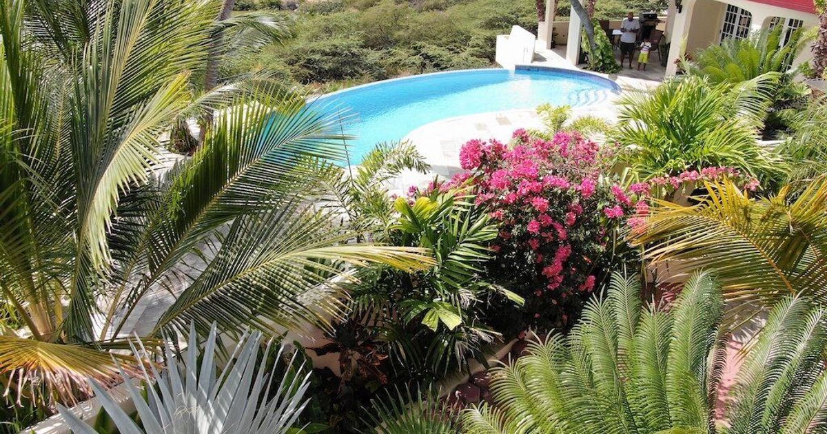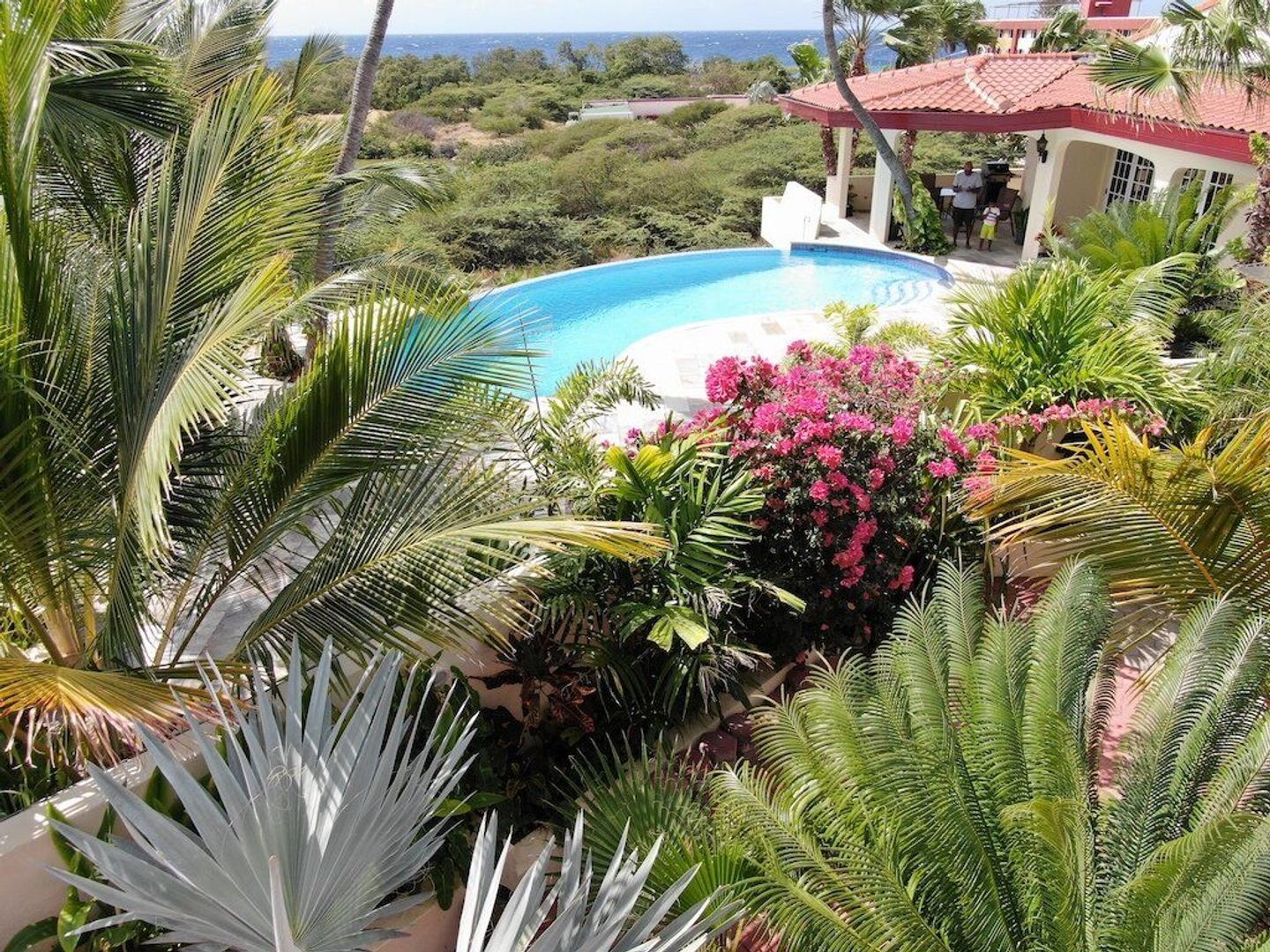 Via een mooie oprit die voldoende ruimte biedt voor het parkeren van meerdere auto's, bereikt u de voorzijde van dit unieke tweelaagse appartement. Bij binnenkomst in dit lichte en ruime appartement bevindt u zich in de woonkamer met een grote open moderne keuken en glazen paneeldeuren die de voorzijde volledig openen naar een koninklijk overdekt terras, groot genoeg om te entertainen en te BBQ-en met familie en vrienden. Aan deze zijde heeft u een schitterend uitzicht over het groen, en de Caribische Zee. Aan de linkerkant komen de woonkamer en keuken uit op het brede - deels overdekte - terras met een prachtig gevormd overloopzwembad, met uitzicht op de schilderachtige groene omgeving, de baai en zijn mangroven en de Caribische Zee. Echt een uniek uitzicht waar je ook kijkt! De keuken, uitgerust met Corian-werkbladen, is voorzien van alle snufjes die een chef-kok zich kan wensen. Veel kastruimte, een kookeiland met inductiekookplaat en alle overige apparatuur zijn bij de hand. Er is ook een pantry voor extra opslag. De bovenste verdieping biedt plaats aan 2 grote moderne slaapkamers met elk 2 ruime badkamers en inloopkasten. De beneden verdieping is bereikbaar via de inpandige trap en herbergt 3 grote moderne slaapkamers, 2 moderne badkamers en een kantoorruimte. Alle slaapkamers hebben voldoende opbergruimte voor uw kleding. Vanuit de slaapkamers beneden bereikt u het terras of u gaat via de trap naar beneden, welke prachtig omlijst is met decoratief gietijzeren hekwerk. Wat dit appartement zo uniek maakt, is niet alleen het schitterende uitzicht over het groen, de baai en de oceaan, maar ook het feit dat het zeer centraal gelegen is. Op 15 min rijafstand van het vliegveld, 10 min van Willemstad, nabij scholen, restaurants, winkels, bioscoop, stranden. Vrijwel alles is zeer dichtbij. Veiligheid is ook geen probleem, aangezien het appartement zich in een gated community bevindt en is uitgerust met een beveiligingssysteem (alarm + bewakingscamera's). Het is een heerlijke villa om met familie en vrienden te entertainen op de verschillende overdekte terrassen die dit appartement te bieden heeft en ook in de ruime tuin die deel uitmaakt van de kavel. Grote keramische tegels en tegels van natuurlijke leisteen worden door de hele villa gebruikt. Zowel 110 V als 220 V is beschikbaar. Er is een geautomatiseerd druppelsysteem voor de bewatering van de weelderige tropische tuin.