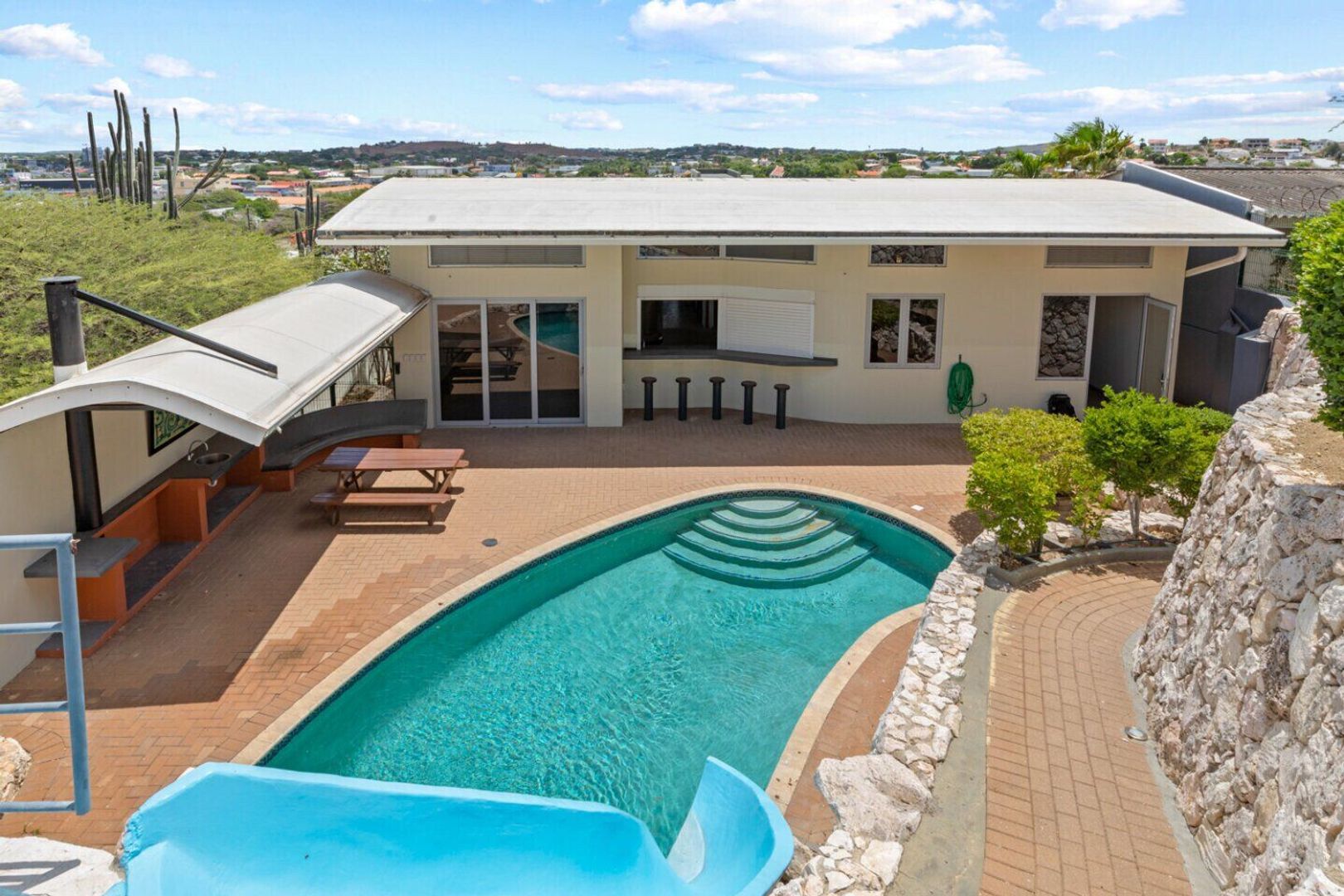 Bijzondere Centraal Gelegen Familiewoning met Prachtig 180 Graden Uitzicht in Salina Abao Locatie: Salina Abao, centraal gelegen ten opzichte van scholen, supermarkten, restaurants, de historische stadsdelen van Otrobanda en Punda en het bekende Mambo Beach. Alle faciliteiten zijn binnen 10 autominuten te bereiken. Omschrijving: Deze unieke familiewoning bevindt zich op een hooggelegen kavel en biedt een adembenemend 180 graden uitzicht. De entree wordt gekenmerkt door een mooi ijzeren automatisch hekwerk. Het beklinkerde pad naar de voordeur wordt geflankeerd door volwassen black olijfbomen, ook wel shady ladies genoemd, en bloeiende bougainvillea. Het zwembad heeft in oktober 2025 een geheel nieuwe coating gekregen, evenals de glijbaan en alle airco's in de woning zijn vervangen door energiezuigige airco's van het merk Daikin. Begane Grond: Ruime hal met een kast voor de generator. Twee slaapkamers aan de voorzijde, elk met een badkamer en toilet. Eén slaapkamer heeft een eigen royale badkamer en een extra verscholen ruimte. Een interne trap, volledig omlijst met fraai smeedijzeren hekwerk van Mexico Lindo, leidt naar de bovenverdieping. Bovenverdieping: Woonkamer met een prachtig hout betimmerd hoog plafond waardoor er een warme sfeer is in de ruimte. Royale open keuken met kookeiland, 5-pits fornuis, lange opstelling met houten kasten, inbouwoven, en veel werkruimte. Balkon met prachtig uitzicht over de stad. Ruimte voor de wasmachine achter een speelse ronde muur. Gastentoilet. Drie slaapkamers: twee delen een badkamer en de hoofdslaapkamer heeft een ensuite badkamer, walk-in closet, en een balkon. Buiten: Terras met robuuste overkapte buitenkeuken, ideaal voor entertainment en barbecues. Royale speels vormgegeven zwembad met glijbaan, separate douche en toilet ruimte. Hoger gelegen terras met zitruimte en panoramisch uitzicht. Beveiligd met beamers, onderhoudsvrije ramen en schuifdeuren in aluminium frames. Veel grote hoge ramen en doorkijkjes voor een licht en ruimtelijk gevoel. Bijzonderheden: Twee verscholen ruimtes: een achter een kast in de hoofdslaapkamer en een grotere beneden. Dakspanten van metalen I-profielen, zwaar gehecht aan de muren voor stormbestendigheid. Japanse industriële generator, extreem stil en volledig automatisch. Voorzien van een ingebouwde externe diesel tank, kan deze de gehele woning van stroom voorzien voor minimaal 4 dagen, in de praktijk 6-7 dagen. De generator voorziet ook de deepwell pomp en de solar pomp voor het zwembad van stroom bij een stroomstoring. Conclusie: Deze bijzondere familiewoning biedt luxe, comfort, en een spectaculair uitzicht, gelegen in het hart van Salina Abao met alle voorzieningen binnen handbereik. Een ideale woning voor wie op zoek is naar ruimte, stijl en veiligheid. Neem contact op met Jacqueline Remmelts voor meer informatie via +5999 5123803.