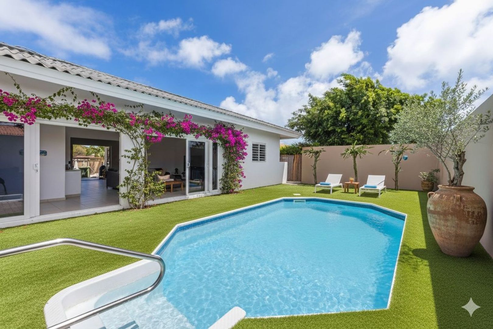 Goed onderhouden villa met privé zwembad te koop op Villa Park the Pearl te Santa Catharina. Deze prachtige villa is gelegen in het rustige en populaire gated community Villa Park the Pearl te Santa Catharina. De villa is omgeven door een fraai aangelegde tuin met zwembad. Bij de huidige eigenaren wonen zeer jonge kinderen. Om die reden is het zwembad momenteel afgezet. Met behulp van een visuele bewerking hebben wij de foto daarom aangepast, zodat een indruk wordt gegeven van hoe het zwembad en de directe omgeving eruit zouden kunnen zien wanneer het zeil wordt verwijderd en bijvoorbeeld gras rondom het zwembad wordt aangelegd. Deze afbeelding is uitsluitend bedoeld ter illustratie, als suggestie en om een beeld te geven van de mogelijke uitstraling van de buitenruimte. Bij binnenkomst van deze villa bevindt u zich in de woonkamer met een hoog plafond hetgeen een ruimtelijke sfeer geeft. Aan de rechterzijde is een open keuken met inbouwapparatuur. Tevens is er een ruime inpandige ruimte aanwezig met de wasmachine aansluiting en voor opslag. Door de vele ramen is er veel licht in de woonkamer en keuken. Aan de linkerzijde van de villa zijn drie ruime slaapkamers met airconditioning gelegen, waarvan de master slaapkamer is voorzien van een en-suite badkamer. De overige twee slaapkamers delen de tweede badkamer. Er is warm water in de badkamers via warm water heaters. De woning is voorzien van 110 Volt en in de keuken en de achtertuin is 220 Volt aanwezig. Er is een open doorgang vanuit de woonkamer naar de overdekte en ruime porch die door zijn forse afmetingen als een tweede woonkamer dient. Via de schuifdeuren komt men in de tuin die voorzien is van een zwembad en een gazebo. Het zwembad is momenteel afgezet als veiligheid i.v.m. de aanwezigheid van een klein kind. Er is een deepwell aanwezig voor de tuin en het zwembad. Deze wordt gedeeld met de villa nr. 11. De deepwell is in het verleden aangebracht door de vorige eigenaren van beide woningen en er is een gebruiksovereenkomst, die telkenmale overgaat naar een nieuwe eigenaar. Verder is de villa voorzien van zes zonnepanelen. De villa is uitermate geschikt voor vakantie verhuur. De villa biedt: - Instap klaar - 3 slaapkamers met airconditioners - 2 Badkamers - Open keuken met inbouwapparatuur - Ruime woon- eetkamer - Ruime tuin voorzien van een gazebo - Privé zwembad - Deepwell - Zes zonnepanelen - Omheind - Parkeergelegenheid op het terrein Het perceel is volledig omheind en heeft een totaaloppervlakte van 524 m2. Het betreft erfpacht grond, deze loopt nog tot 29 oktober 2053 (erfpacht belasting bedraagt XCG 3, -/m2 per jaar) en zal daarna weer worden verlengd. De villa heeft een totaal bebouwd oppervlakte van ca. 135 m2. Op steenworp afstand bevinden zich vele wandel-/ en fietsroutes in het achtergelegen recreatiegebied Sint Jorisbaai. In de nabije omgeving bevinden zich diverse ontwikkelingen waaronder Hofi Oasis. Het centrum van Willemstad ligt op slechts 20 minuten rijden evenals populaire stranden (Seaquarium Beach, Jan Thiel Beach) en het Spaanse Water. Er zijn verschillende wandelpaden in de buurt, evenals de Ostrich Farm en de St. Jorisbaai, een perfecte plek voor surfliefhebbers. De vraagprijs voor deze prachtige villa bedraagt EUR 328.500, - k.k.