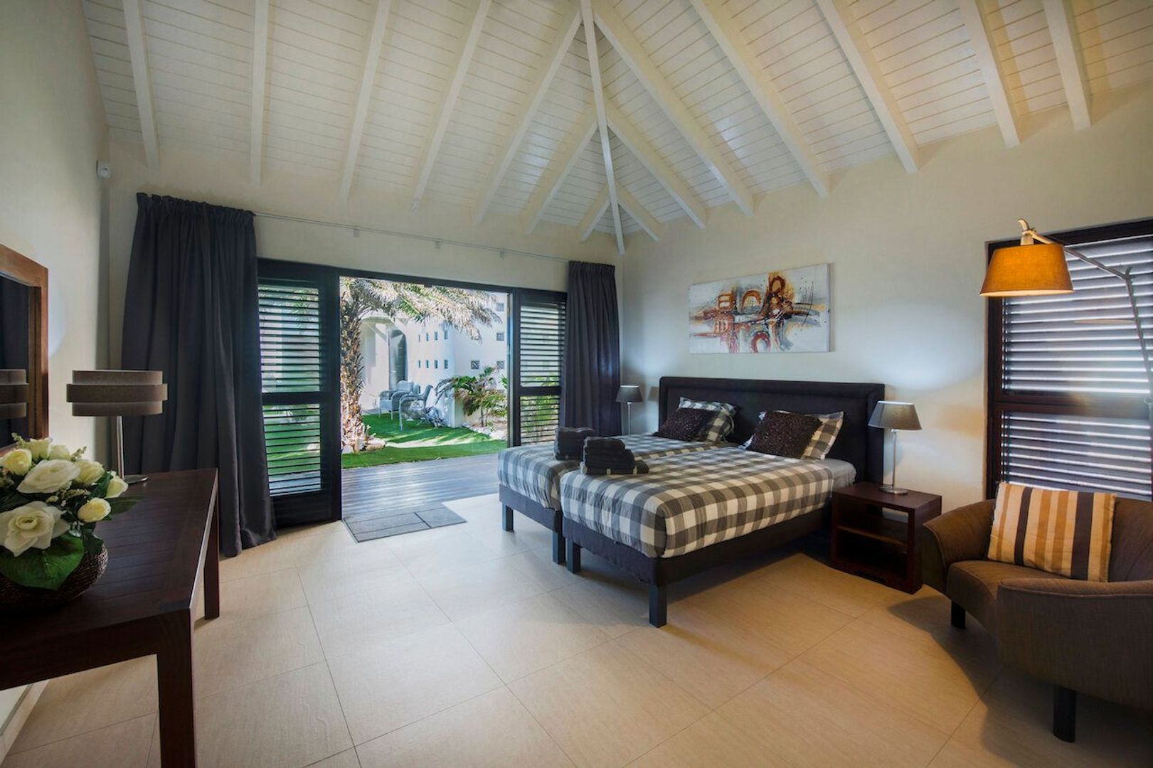 Op het zeer populaire Vista Royal op het zonnige Curaçao is deze adembenemende villa nu te koop. De villa is prachtig gelegen met direct zicht op zee en het schiereiland van Caracasbaai. De villa ligt op loopafstand van het gezellige strand van Jan Thiel Beach. Dit gebied huisvest vele restaurants, een spa, duikschool, diverse winkels, een dokterspost, supermarkt, hotels en high-tec gym. Het is niet voor niets dat Vista Royal tot veruit de meest geliefde plek is verworden om te verblijven tijdens vakantie of om te wonen. Op deze dubbele kavel is een werkelijke schitterend complex gebouwd. Een ruim woonhuis met een zeer ruim gastenverblijf, verbonden door twee zwembaden die via een waterval in elkaar overlopen. De beide woningen kunnen uitstekend los van elkaar bewoond worden. Het woonhuis herbergt ook nog een derde appartement met 3 slaapkamers. Het woonhuis kunt u op meerdere manieren betreden, via de buitentrap vanuit de tuin of via de garage. Als u via de garage, die plaats biedt aan twee grote auto's, binnenkomt komt u eerst langs de gym en de cinema. Deze cinema room heeft airconditioning en is van alle nieuwe technische snufjes voorzien. Als u eenmaal boven bent valt direct het beeldschone uitzicht op de Caribische zee op. De woonkamer gaat over in een ruime buiten porch waar zich een Boretti buitenkeuken bevindt. De keuken binnen is van alle gemakken voorzien zoals de Amerikaanse koelkast, oven, afwasmachine en kookeiland. In de linkervleugel van de villa liggen de slaapkamers van de hoofdwoning. De masterbedroom heeft een eigen walk-in-closet en badkamer. De overige 4 slaapkamers hebben allen hun eigen badkamer en direct toegang tot de porch en het zwembad. Het water van het bovenste zwembad komt middels een waterval in een jacuzzi beneden terecht en daarna in het tweede zwembad. Dit tweede, grote zwembad ligt tussen het appartement en het gastenverblijf. Het appartement bestaat uit 3 slaapkamers, 2 badkamers, een woonkamer met open keuken en porch. Het gastenverblijf is een villa op zich. Het biedt plaats aan 6 personen, ieder van de drie slaapkamers heeft een eigen badkamer. De open keuken met kookeiland heeft zicht op de woonkamer, porch, het zwembad en de zee. De woning is voorzien van 56 zonnepanelen, beveiliging met een camera systeem waar het beveiligingsbedrijf op mee kan kijken en ondergrondse waterbak tbv de beregening van de tuin. Op eigen terrein is er voldoende parkeergelegenheid. De woning is zeer geschikt voor dubbele bewoning, residentie, luxe vakantievilla of investeringsobject met betrekking tot verhuur. De omliggende smaakvol aangelegde tuin maakt het geheel af en samen met het lichtplan maakt het dit huis tot 'one of a kind'. Interesse in een kwalitatief hoogwaardige villa? Neem contact met ons op voor een bezichtiging. TE KOOP Prestigieuze prachtig afgewerkte villa Vista Royal Curacao Wilt u als eerst ons nieuwste aanbod zien? Volg ons op Facebook, like onze pagina en volg ons!
