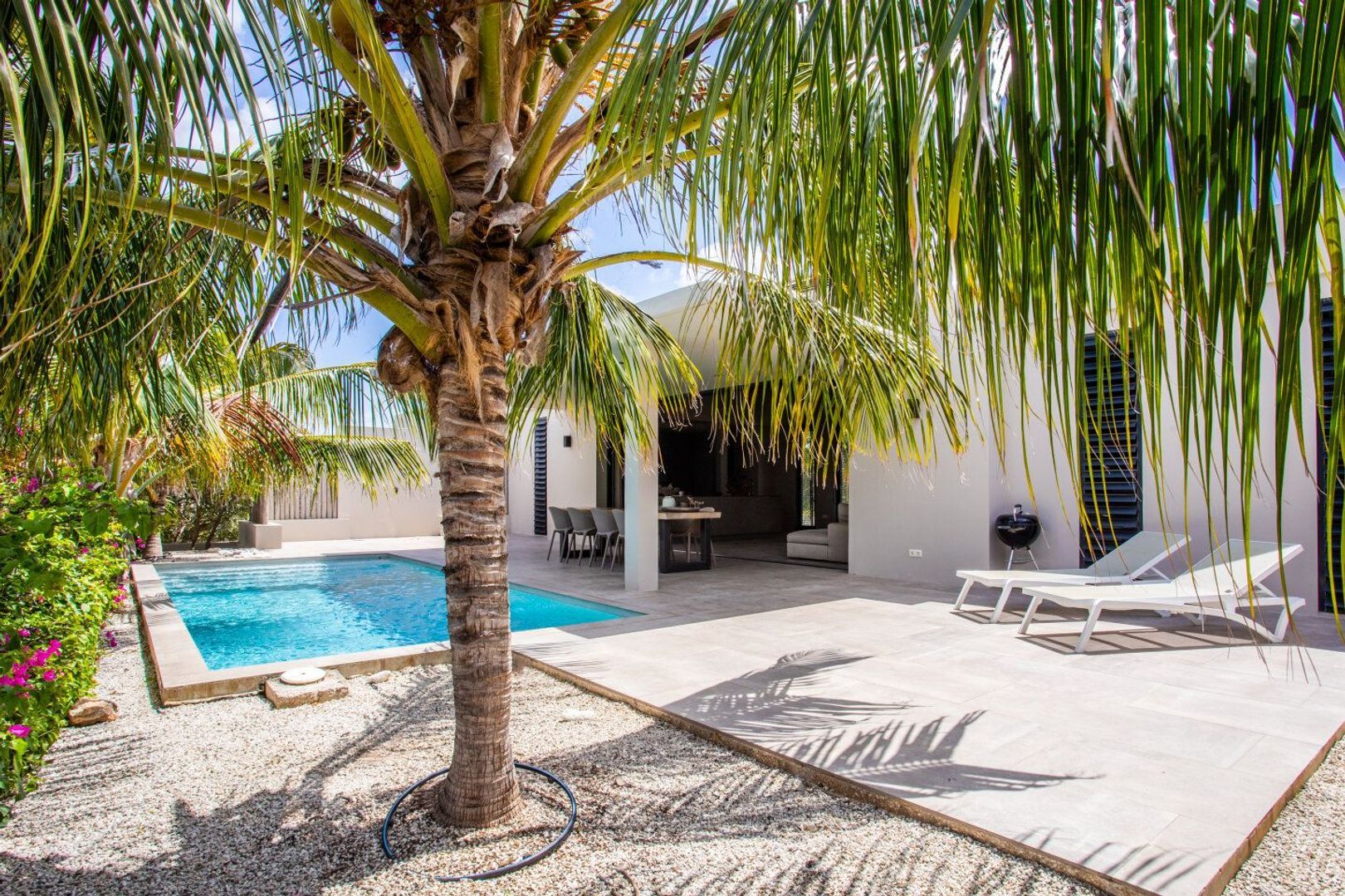 In de bruisende en luxe wijk Vista Royal op Curacao ligt deze oase van rust in deze onder architectuur gebouwde villa. Zodra u aankomt bij de villa valt direct het kwalitatief hoogwaardige materiaal op dat gebruikt is bij de bouw van deze villa. Ook de prachtige kleurstelling van de muren in combinatie met kozijnen en vloer laten niets meer te wensen over. <h2>Indeling van villa</h2> De villa heeft 3 slaapkamers, 2,5 badkamer, een kantoor die tevens als kleine slaapkamer gebruikt kan worden (nu in gebruik als opslagruimte), een was ruimte, een ruim terras met zwembad van 3,5 x 7,5m, buitendouche en palapa / lounge area. De totale oppervlakte (exclusief de palapa / lounge area) is ongeveer 250m2. De kozijnen van Brakel ( van hen komt ook het hang- en sluitwerk) met de shutters zorgen voor een goede flow van de wind door het gehele huis. Ook de hoge plafonds geven, naast een luxe uitstraling, een extra boost aan de klimaat regulering in de woning. Heel belangrijk voor een aangenaam verblijf in de tropen. De woonkamer voorziet in een heerlijke zithoek en een open keuken concept. De keuken heeft alle denkbare SMEG apparatuur en een modern kookeiland. Houdt u van het entertainen van gasten; dan zult u smullen van deze indeling. Vanuit deze woonruimte heeft u namelijk ook direct contact en zicht op de grote overdekte veranda. Dat is dan ook de plek waar heerlijk gegeten kan worden, met zicht op de tropische tuin en het azuurblauwe water van het zwembad. Links van de woonruimte en keuken bevindt zich de mastersuite; een ruime suite die bestaat uit een grote slaapkamer, met toegang tot de tropische tuin en de aangrenzende porch. Ook vindt u hier een badkamer met dubbele wastafels van natuursteen uit Bali. De inloopdouche is prachtig afgewerkt met een glazen wand. De mastersuite is natuurlijk niet compleet zonder een ruime inloopkast met genoeg ruimte voor al uw slippers, korte broeken en zomerjurkjes. Jassen en truien heeft u niet nodig op Curacao. In deze linkervleugel bevindt zich nog een kleine slaapkamer voor een 1 persoonsbed, deze kamer heeft net als alle andere slaapkamers ook airco. Momenteel wordt deze kamer gebruikt als een ruime opslagruimte voor de verhuur van de woning ( opslag van linnengoed, extra servies etc) Rechts van de woonruimte bevinden zich de andere twee slaapkamers en de tweede badkamer. Ook deze slaapkamers zijn uitgerust met heerlijke bedden en de badkamer heeft dezelfde luxe uitstraling als in de mastersuite. Tevens is hier een separaat gastentoilet en een ruime was- en droogruimte. Het zwembad is naadloos ingebouwd in de porch en wordt geflankeerd door een palapa met zitje en een buitendouche. Onder de woning bevindt zich een volwaardig appartement met eigen opgang die vanuit de hoofdwoning niet zichtbaar is. Het appartement heeft een woonkamer met open keuken, berging / wasruimte, badkamer, slaapkamer en ruime porch. Daarnaast is er een eigen parkeerplek. Het appartement heeft een eigen, van het huis afgescheiden, electra meter. Op het terrein is ook nog een ruime inpandige berging voor de hoofdvilla en apart pomphuis. Het totale oppervlak bedraagt 75m2. Tevens heeft de woning een alarmsysteem. De villa wordt geheel gemeubileerd opgeleverd, met uitzondering van het appartement. De inrichting is van de hand van de beroemde interieur architect Eric Kuster. Het lichtplan door het gehele huis en in de tuin is ontworpen en geleverd door de lichtarchitecten van Maretti. Er is nog een mogelijkheid om aan de zijkant van het huis een trap te maken zodat je nog een dakterras kan realiseren van ongeveer 50m2. Vanaf hier heb je een geweldig uitzicht op Jan Thiel Baai en de zee. De villa en het appartement worden door de huidige eigenaar verhuurd, en kent een hoge bezetting. Bij aankoop kan deze verhuur moeiteloos worden doorgezet met het soepel werkende team van beheerders en bijbehorende staf. De details hierover krijgt u uiteraard als u interesse heeft voor deze villa. Uiteraard is de woning ook zeer geschikt voor eigen bewoning en kan het appartement goed dienen als kantoor aan huis, gastenverblijf of woonruimte voor inwonend personeel. De mogelijkheden zijn oneindig. Zoekt u een top of the bill, turn key, volledig gemeubileerde woning, op loopafstand van Jan Thiel Beach, aarzel dan niet om contact met ons op te nemen. Wij laten u graag zien dat het huis in het echt stiekem nog mooier is.