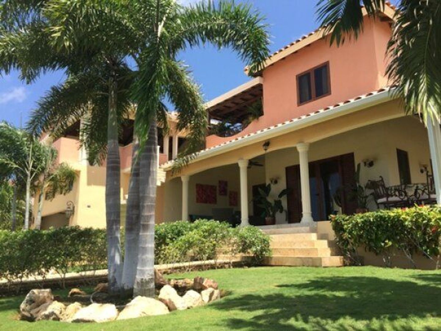 Deze prachtige villa is gelegen op het beveiligde villapark Zuurzak. Op een steenworp afstand van de vele flamingo's die leven in de zoutpannen van Jan Thiel en vlakbij de populaire stranden van Seaquarium Beach en Jan Thiel. De villa is gebouwd met een zeer hoge kwaliteit. De ruime kavel is goed benut waardoor er vele gezellige hoekjes zijn om te zitten. Er is een ruim zwembad met jacuzzi, een loungeterras en drie toegangspoorten. Op de begane grond bevindt zich een ruime woonkeuken. De keuken is uitgerust met alle denkbare apparatuur zoals een combi oven magnetron, een stoomoven en een inbouw espresso apparaat van het merk AEG. Naast de dubbele koelkast en vriezer ( beide BOSCH) is er ook nog een ruime wijnkoeling. Uiteraard is er ook een afwasmachine. De kookpitten zijn mooi ingebouwd in het granieten keukenblad en er is tevens een grill. Naast de woonkeuken bevindt zich de gezellige woonkamer. Onder de trap naar boven bevindt zich het gastentoilet. Over de gehele lengte van de woonkeuken en kamer is de porch gebouwd met aansluitend het zwembad en jacuzzi. Naast de buitenkeuken bevindt zich nog een toilet en uiteraard een buitendouche. Een kleine gang leidt naar de twee slaapkamers en badkamer die zich op de beneden verdieping bevinden. Een van de slaapkamers heeft ook een eigen ingang en een leuk terras om te zitten. De ruime badkamer heft een hoog plafond, een douche en een apart ligbad. De trap naar boven leidt naar de zeer ruime mastersuite. Deze bestaat uit een slaapgedeelte en een cinema gedeelte. De grote badkamer biedt ruimte aan een jacuzzi, stoom douche en een dubbele wastafel wand. De walk in closet heeft een fan en een kluis voor kostbaarheden. Opvallend aan deze mastersuite is het spectaculaire plafond. Deze cathedral ceiling is helemaal bedekt met bamboe. Dit geeft een heel gezellig en romantisch gevoel. Aan de mastersuite zijn twee danwel drie grote terrassen verbonden. Een aan de kant van het zwembad. Hier heb je tevens zicht op de tafelberg. Aan de andere kant, is er eerst een klein terras met een doorloop naar een heel groot terras met uitzicht op de zoutpannen en de flamingo's. Hier is een zithoek gecreëerd met een televisie. Tevens is deze porch bereikbaar via een trap vanuit de tuin. Onder dit terras bevindt zich een garage voor twee auto's en een ruime berging. Ook is hier een ruimte voor de wasmachine en droger. Via de garage kunt u ook de keuken bereiken. De garagedeuren werken met een afstandbediening. Tevens heeft het huis een alarm, welke ook met een afstandbediening te gebruiken is. De prachtig aangelegde tuin is aangesloten op een dripsysteem en een deepwell. De huur bedraagt in ANG 5500 Deze zeer goed afgewerkte woning is zowel te koop als te huur.